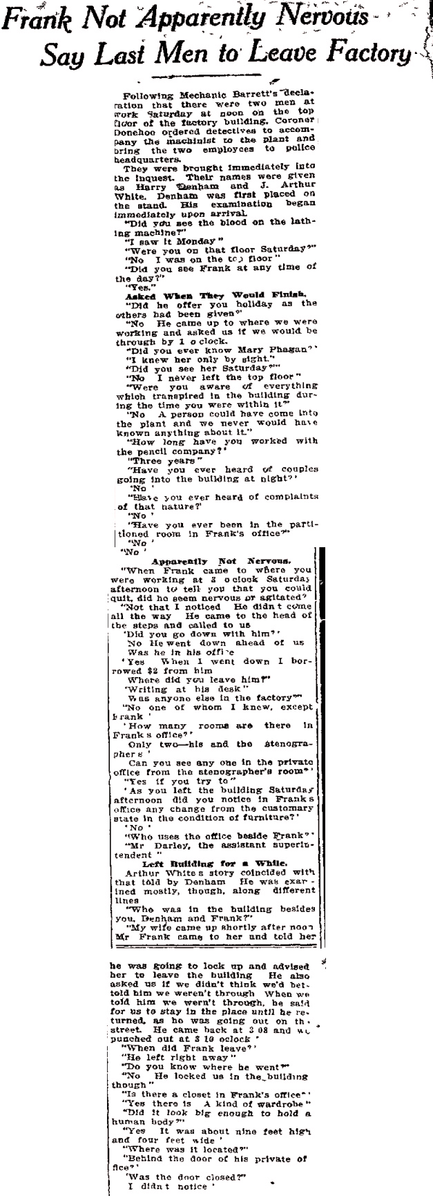"My wife came up shortly after noon. Mr. Frank came to her and told her he was going to lock up and advised her to leave the building. He also asked us if we didn't think we'd bet-told him we weren't through. When we told him we weren't through, he said for us to stay in the place until he returned, as he was going out on the street. He came back at 3:08 and we punched out at 3:10 o'clock."