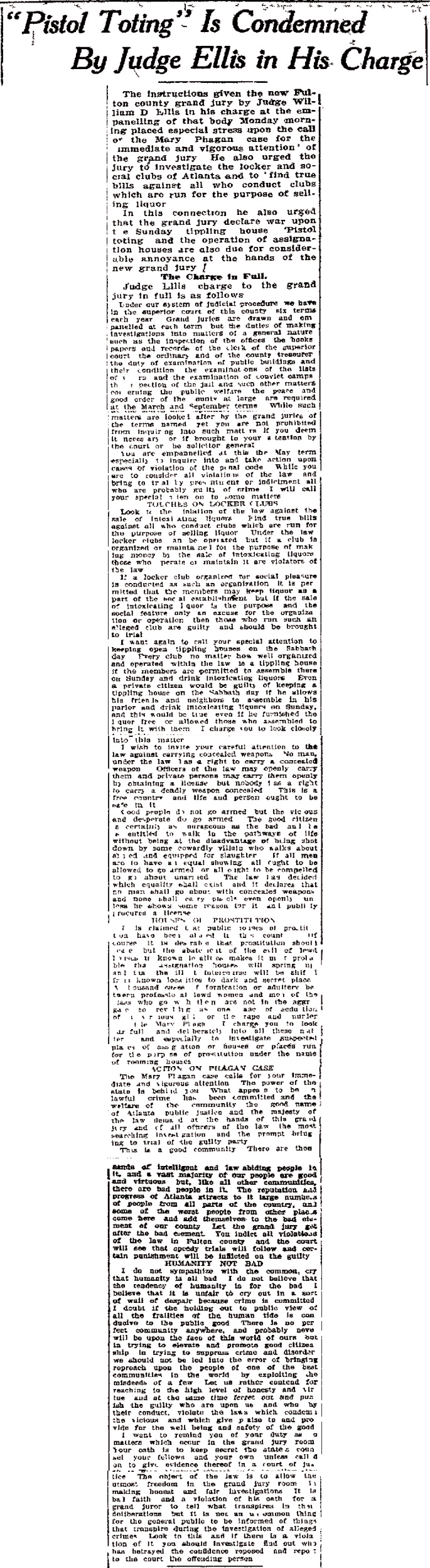 The instructions given the new Fulton county grand jury by Judge William D. Ellis in his charge at the empanelling of that body Monday morning placed especial stress upon the call of the Mary Phagan case for the "immediate and vigorous attention" of the grand jury. He also urged the jury to investigate the locker and social clubs of Atlanta and to "find true bills against all who conduct clubs which are run for the purpose of selling liquor."