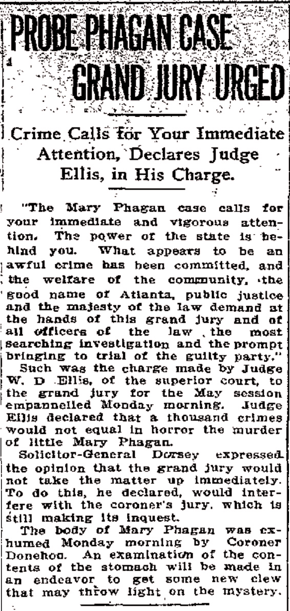 "The Mary Phagan case calls for your immediate and vigorous attention. The power of the state is behind you. What appears to be an awful crime has been committed, and the welfare of the community, the good name of Atlanta, public justice and the majesty of the law demand at the hands of this grand jury and of all officers of the law the most searching investigation and the prompt bringing to trial of the guilty party."