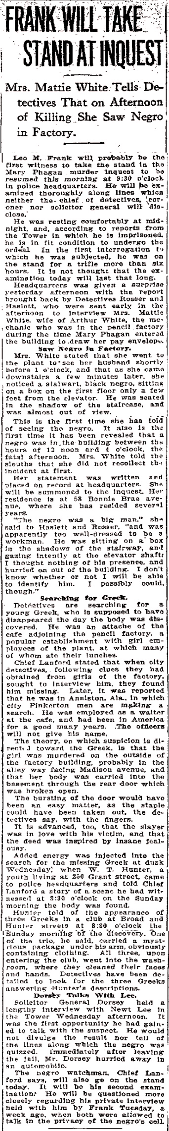 Leo M. Frank will probably be the first witness to take the stand in the Mary Phagan murder inquest to be resumed this morning at 9:30 o'clock in police headquarters. He will be examined thoroughly along lines which neither the chief of detectives, coroner nor solicitor general will disclose.