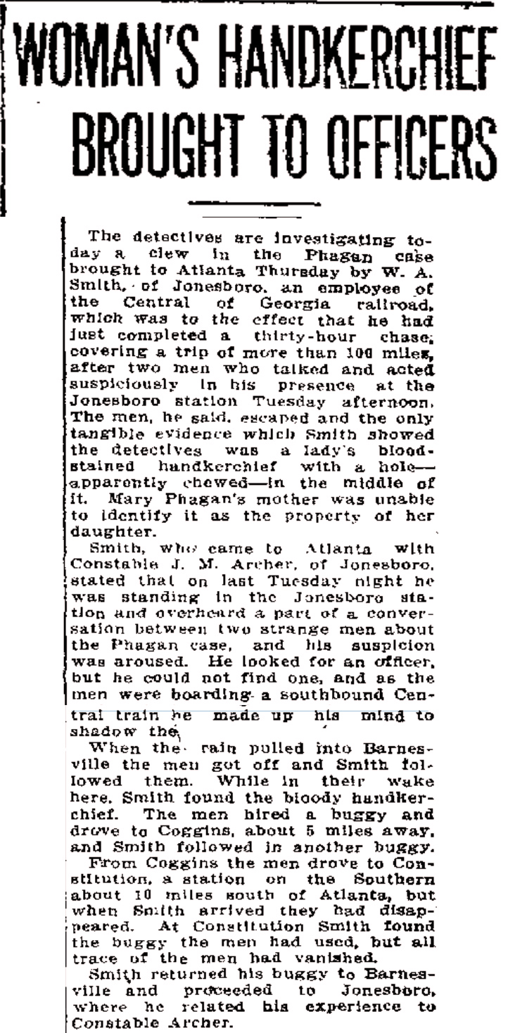 The detectives are investigating today a clew in the Phagan case brought to Atlanta Thursday by W. A. Smith, of Jonesboro, an employee of the Central of Georgia railroad, which was to the effect that he had just completed a thirty-hour chase, covering a trip of more than 100 miles, after two men who talked and acted suspiciously in his presence at the Jonesboro station Tuesday afternoon. The men, he said, escaped and the only tangible evidence which Smith showed the detectives was a lady's blood-stained handkerchief with a hole—apparently chewed—in the middle of it. Mary Phagan's mother was unable to identify it as the property of her daughter.