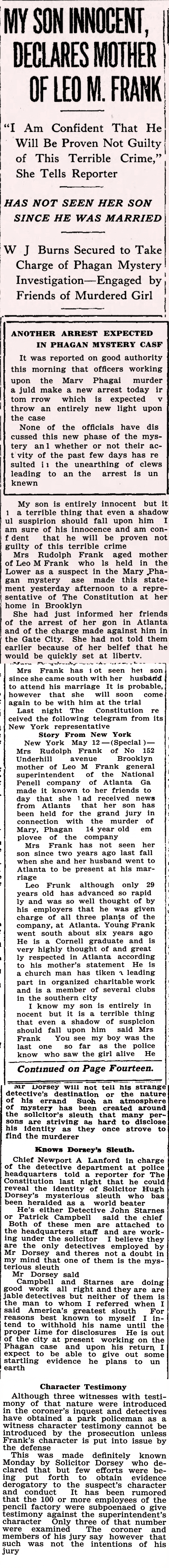"I know my son is entirely innocent but it is a terrible thing that even a shadow of suspicion should fall upon him," said Mrs. Frank. "You see, my boy was the last one so far as the police know who saw the girl alive. He gave her her pay envelope on Saturday, two weeks ago, and she was not seen alive after that. I am sure of his innocence and am confident he will be proven not guilty of this terrible crime."