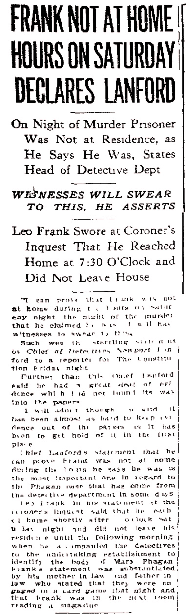 Chief Lanford's statement that he can prove Frank was not at home during the hours he says he was is the most important one in regard to the Phagan case that has come from the detective department in some days.