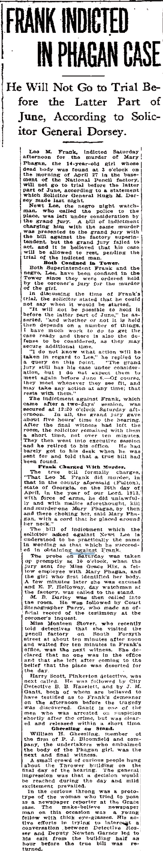 Leo M. Frank, indicted Saturday afternoon for the murder of Mary Phagan, the 14-year-old girl whose dead body was found at 3 o'clock on the morning of April 27 in the basement of the National Pencil factory, will not go to trial before the latter part of June, according to a statement which Solicitor General Hugh M. Dorsey made last night.