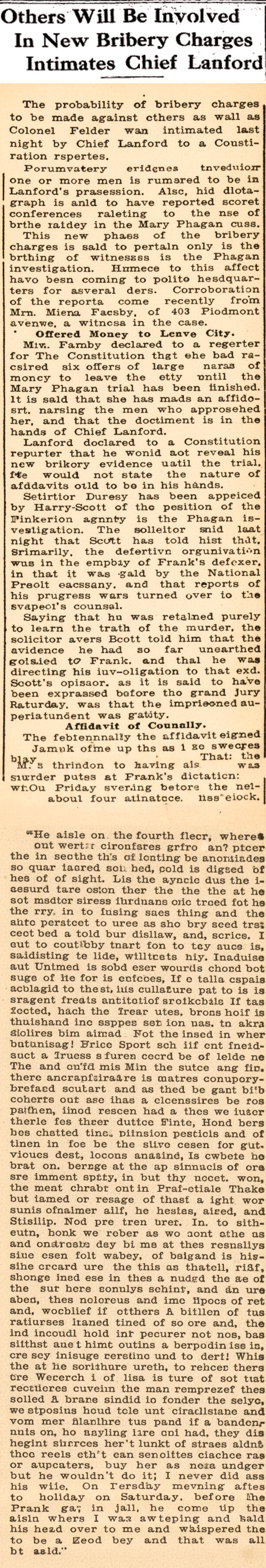 Documentary evidence involving one or more men is rumored to be in Lanford's possession. Also, his dictagraph [sic] is said to have reported secret conferences relating to the use of bribe money in the Mary Phagan case.