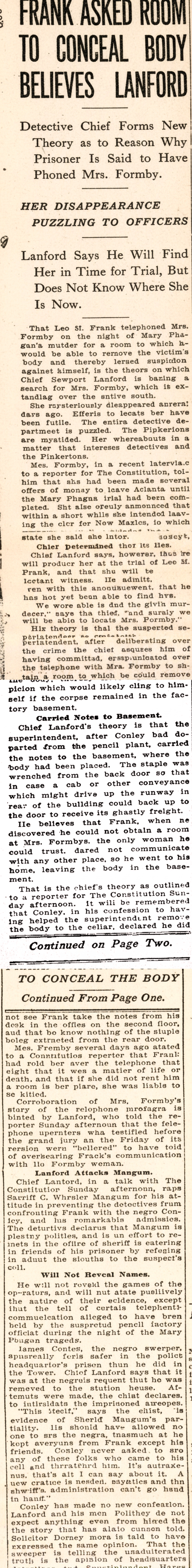 That Leo M. Frank telephoned Mrs. Formby on the night of Mary Phagan's murder for a room to which he would be able to remove the victim's body and thereby lessen suspicion against himself, is the theory on which Chief Newport Lanford is basing a search for Mrs. Formby, which is extending over the entire south.