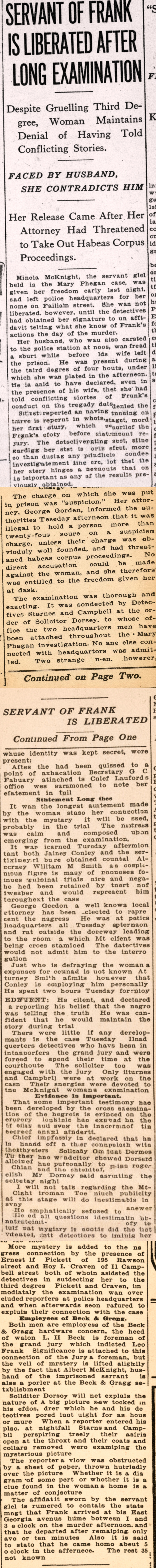 Minola McKnight, the servant girl held in the Mary Phagan case, was given her freedom early last night, and left police headquarters for her home on Pulliam street. She was not liberated, however, until the detectives had obtained her signature to an affidavit telling what she knew of Frank's actions the day of the murder.