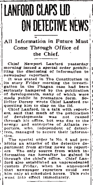 It was stated in The Constitution in its story Friday morning the investigation in the Phagan case had been seriously hampered by the publication of developments, many of which were made public in premature form. Solicitor Dorsey wrote Chief Lanford requesting him to clap on the lid.