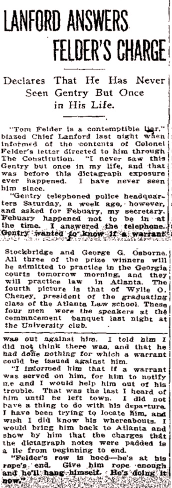 "Tom Felder is a contemptible liar," blazed Chief Lanford last night when informed of the contents of Colonel Felder's letter directed to him through The Constitution. "I never saw this Gentry but once in my life, and that was before this dictagraph exposure ever happened. I have never seen him since.