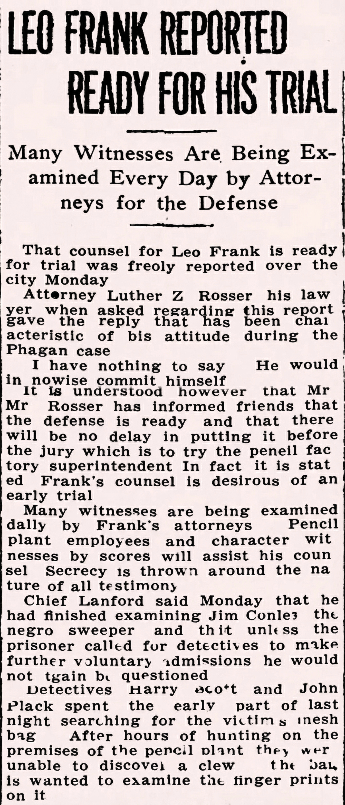 - 0652) Monday, 30th November 1914: No Delay Expected In Leo Frank Case, The Atlanta Constitution [Last Updated On: July 9th, 2025] [Originally Added On: July 8th, 2025]