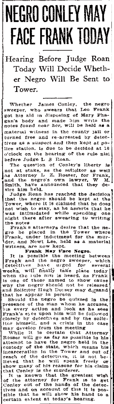 While it is certain that Attorney Rosser will go as far as possible in his attempt to have the negro held in the custody of the state, which means his incarceration in the Tower and out of reach of the detectives, it is not believed that he will speak freely or show many of his reasons for his claim that Conley is the murderer.