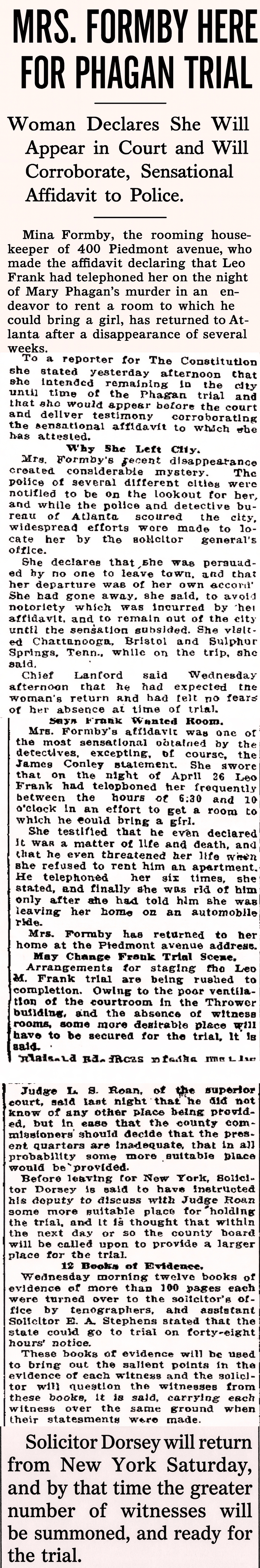 Mima [sic] Formby, the rooming housekeeper of 400 Piedmont avenue, who made the affidavit declaring that Leo Frank had telephoned her on the night of Mary Phagan's murder in an endeavor to rent a room to which he could bring a girl, has returned to Atlanta after a disappearance of several weeks.