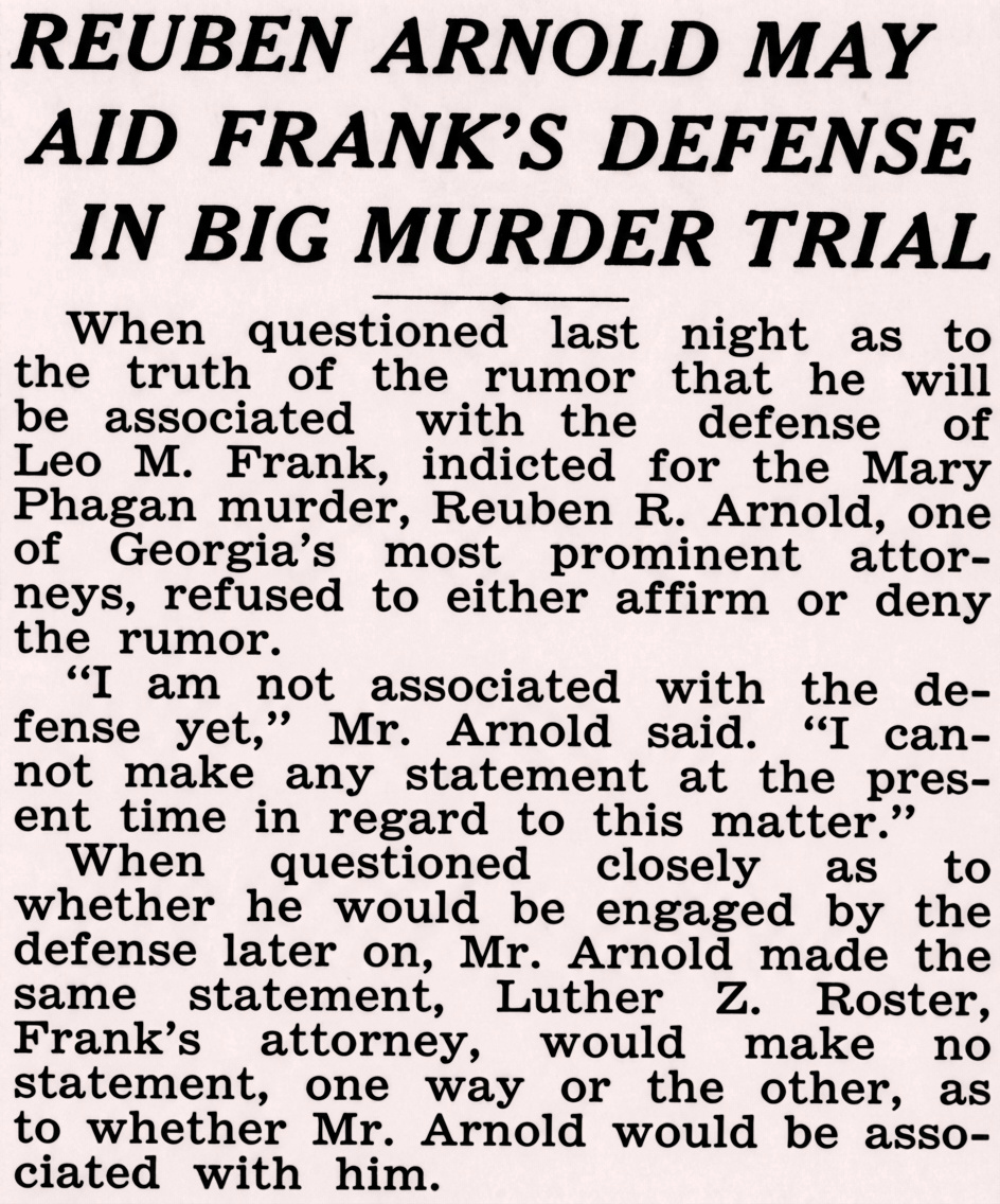 When questioned last night as to the truth of the rumor that he will be associated with the defense of Leo M. Frank, indicted for the Mary Phagan murder, Reuben R. Arnold, one of Georgia's most prominent attorneys, refused to either affirm or deny the rumor.