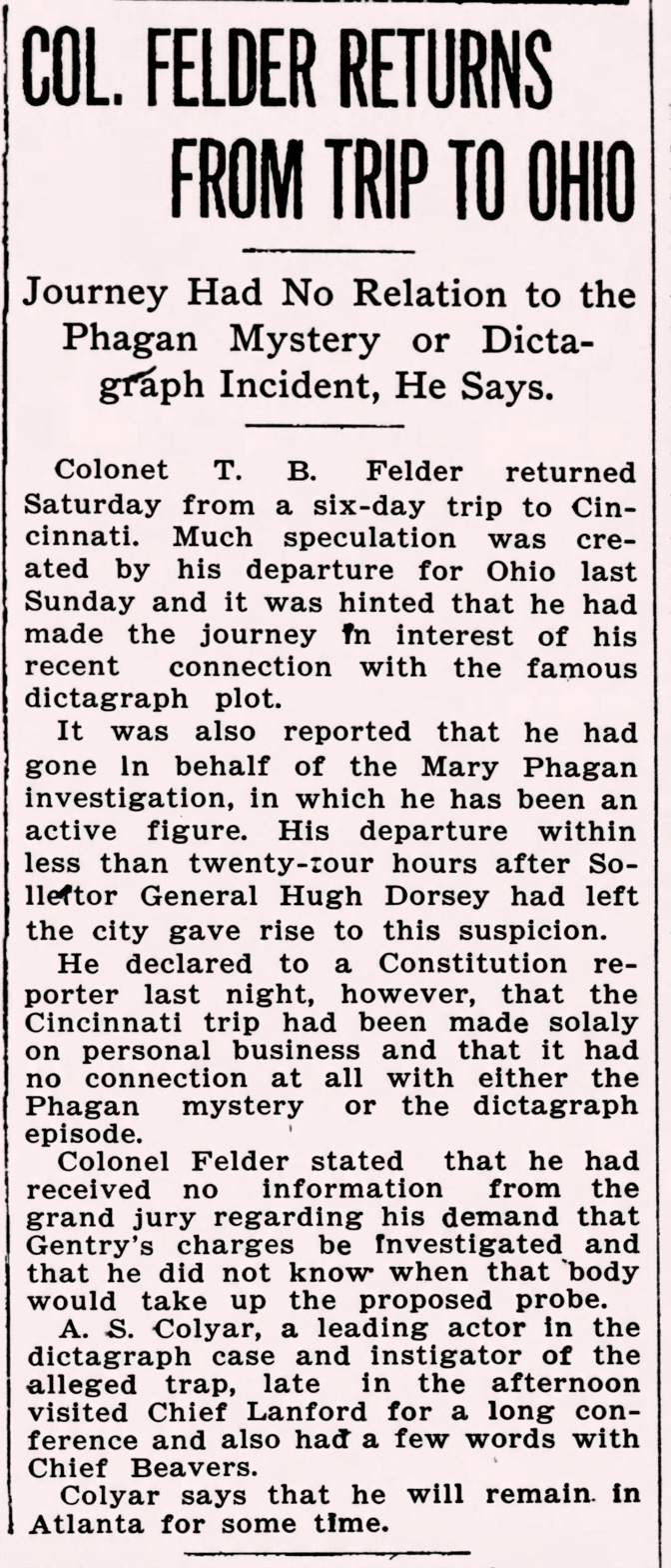 Colonel T. B. Felder returned Saturday from a six-day trip to Cincinnati. Much speculation was created by his departure for Ohio last Sunday and it was hinted that he had made the journey in interest of his recent connection with the famous dictagraph plot.