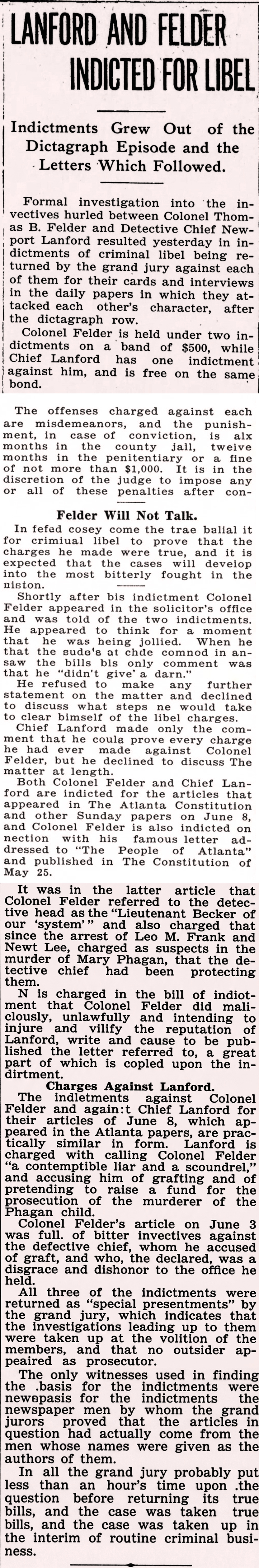 Both Colonel Felder and Chief Lanford are indicted for the articles that appeared in The Atlanta Constitution and other Sunday papers on June 8, and Colonel Felder is also indicted on another bill for alleged libel in connection with his famous letter addressed to "The People of Atlanta" and published in The Constitution of May 25.