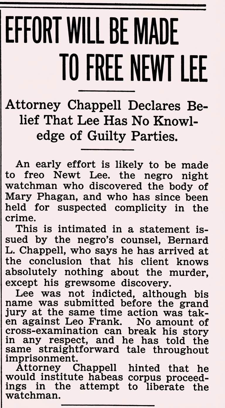 An early effort is likely to be made to free Newt Lee, the negro night watchman who discovered the body of Mary Phagan, and who has since been held for suspected complicity in the crime.