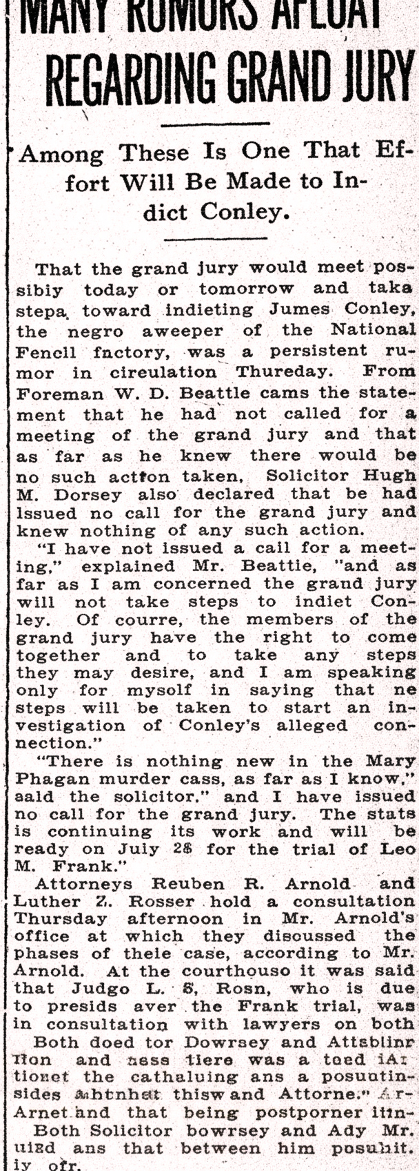 That the grand jury would meet possibly today or tomorrow and take steps toward indicting James Conley, the negro sweeper of the National Pencil factory, was a persistent rumor in circulation Thursday. From Foreman W.D. Beattie came the statement that he had not called for a meeting of the grand jury and that as far as he knew there would be no such action taken. Solicitor Hugh M. Dorsey also declared that he had issued no call for the grand jury and knew nothing of any such action.