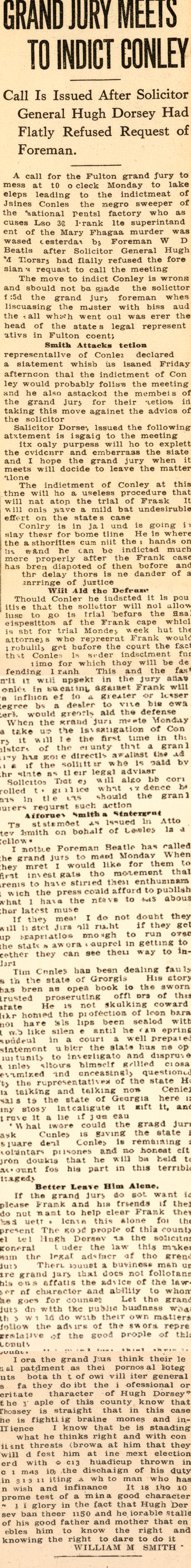 If the grand jury do not want to please Frank and his friends, if they do not want to help clear Frank, they had better leave this alone for the present. The good people of this county elected Hugh Dorsey as the solicitor general. Under the law this makes him the legal adviser of the grand jury. There is not a business man on the grand jury that does not follow in his own affairs the advice of the lawyer of character and ability to whom he goes for counsel. Let the grand jury do with the public business what they would do with their own matters, follow the advice of the sworn representative of the good people of this county.