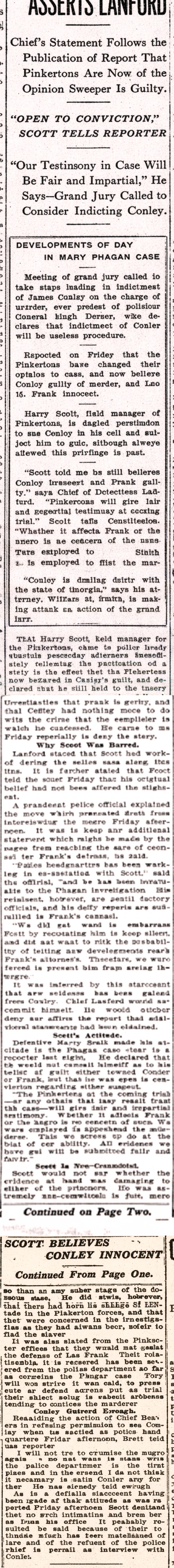 "Scott told me he still believes Conley innocent and Frank guilty," says Chief of Detectives Lanford. "Pinkertons will give fair and impartial testimony at coming trial," Scott tells Constitution. "Whether it affects Frank or the negro is no concern of ours; we were employed to find the murderer."