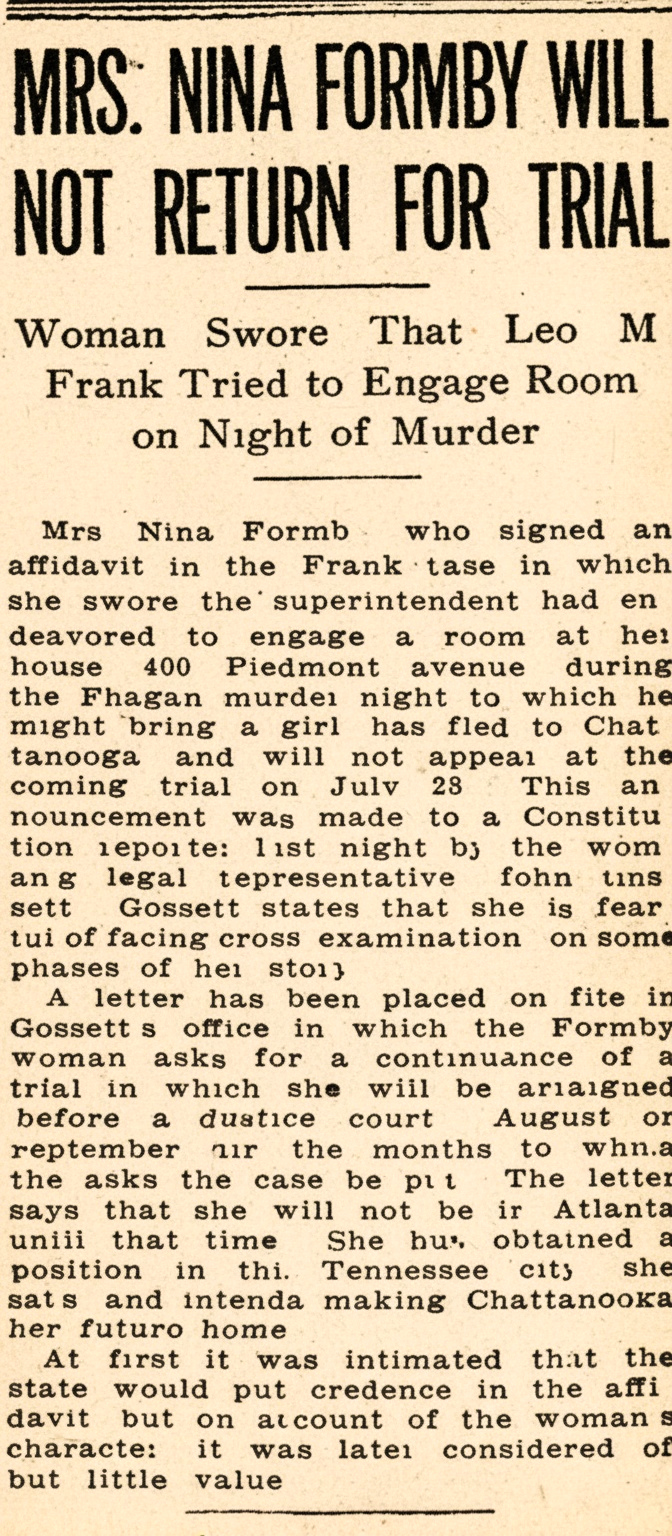 Mrs. Nina Formby, who signed an affidavit in the Frank case in which she swore the superintendent has endeavored to engage a room at her house, 400 Piedmont avenue, during the Phagan murder night to which he might bring a girl has fled to Chattanooga and will not appear at the coming trial on July 28. This announcement was made to a Constitution reporter last night by the woman's legal representative, John Gossett. Gossett states that she is fearful of facing cross examination on some phases of her story.