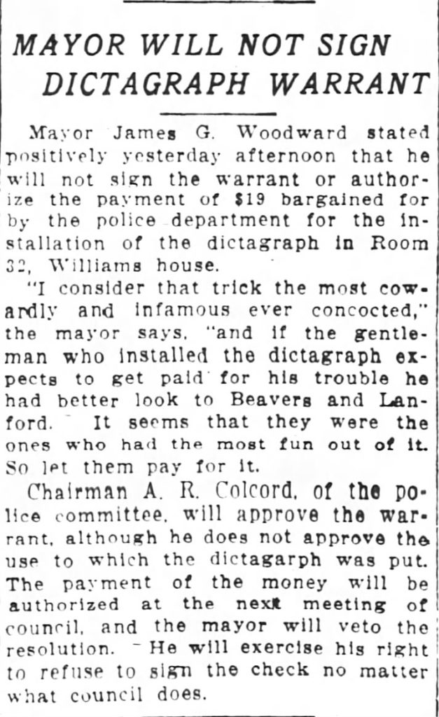 Chairman Colcord said Monday that he did not approve of the use to which the dictagraph was put, but explained that he has been informed that it was never intended to entrap Mayor Woodward or any other city official.