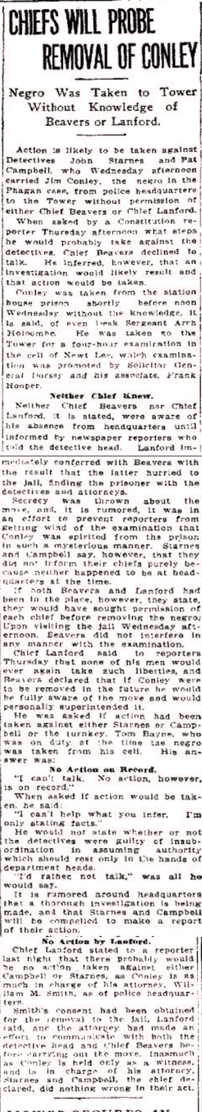 Conley was taken from the station house prison shortly before noon Wednesday without the knowledge, it is said, of even Desk Sergeant Arch Holcombe. He was taken to the Tower for a four-hour examination in the cell of Newt Lee, which examination was promoted by Solicitor General Dorsey and his associate, Frank Hooper.