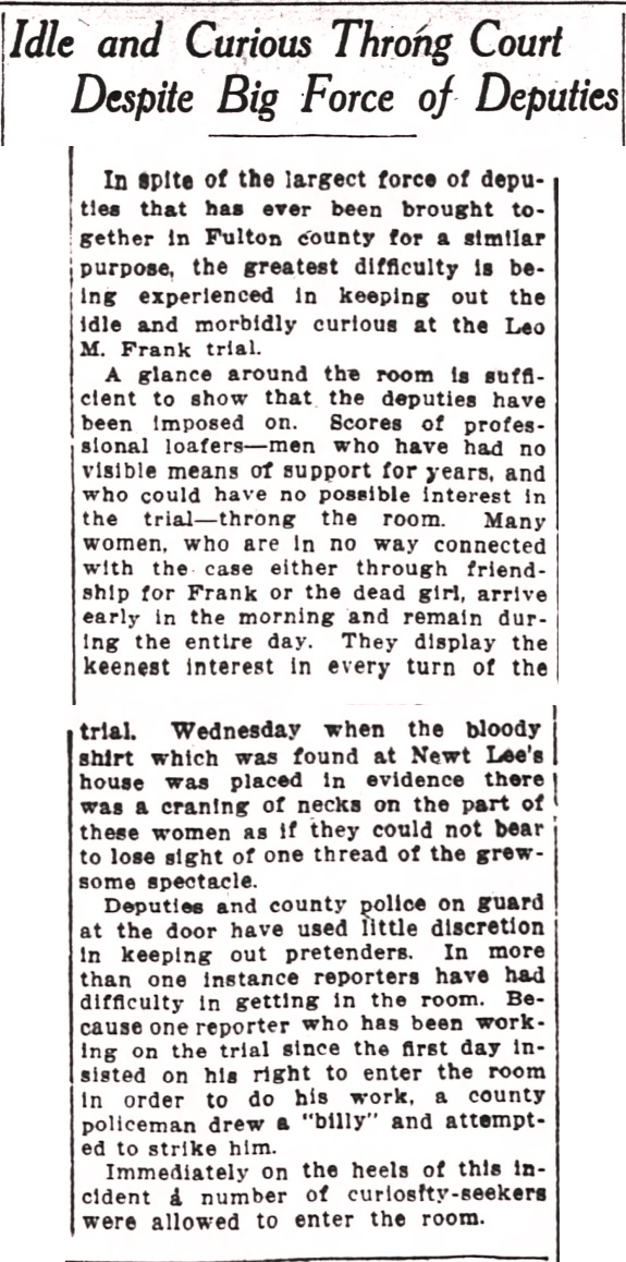 A glance around the room is sufficient to show that the deputies have been imposed on. Scores of professional loafers—men who have had no visible means of support for years, and who could have possible interest in the trial—throng the room. Many women, who are in no way connected with the case either through friendship for Frank or the dead girl, arrive early in the morning and remain during the entire day. They display the keenest interest in every turn of the trial. Wednesday when the bloody shirt which was found at Newt Lee's house was placed in evidence there was a craning of necks on the part of these women as if they could not bear to lose sight of one thread of the grewsome spectacle.