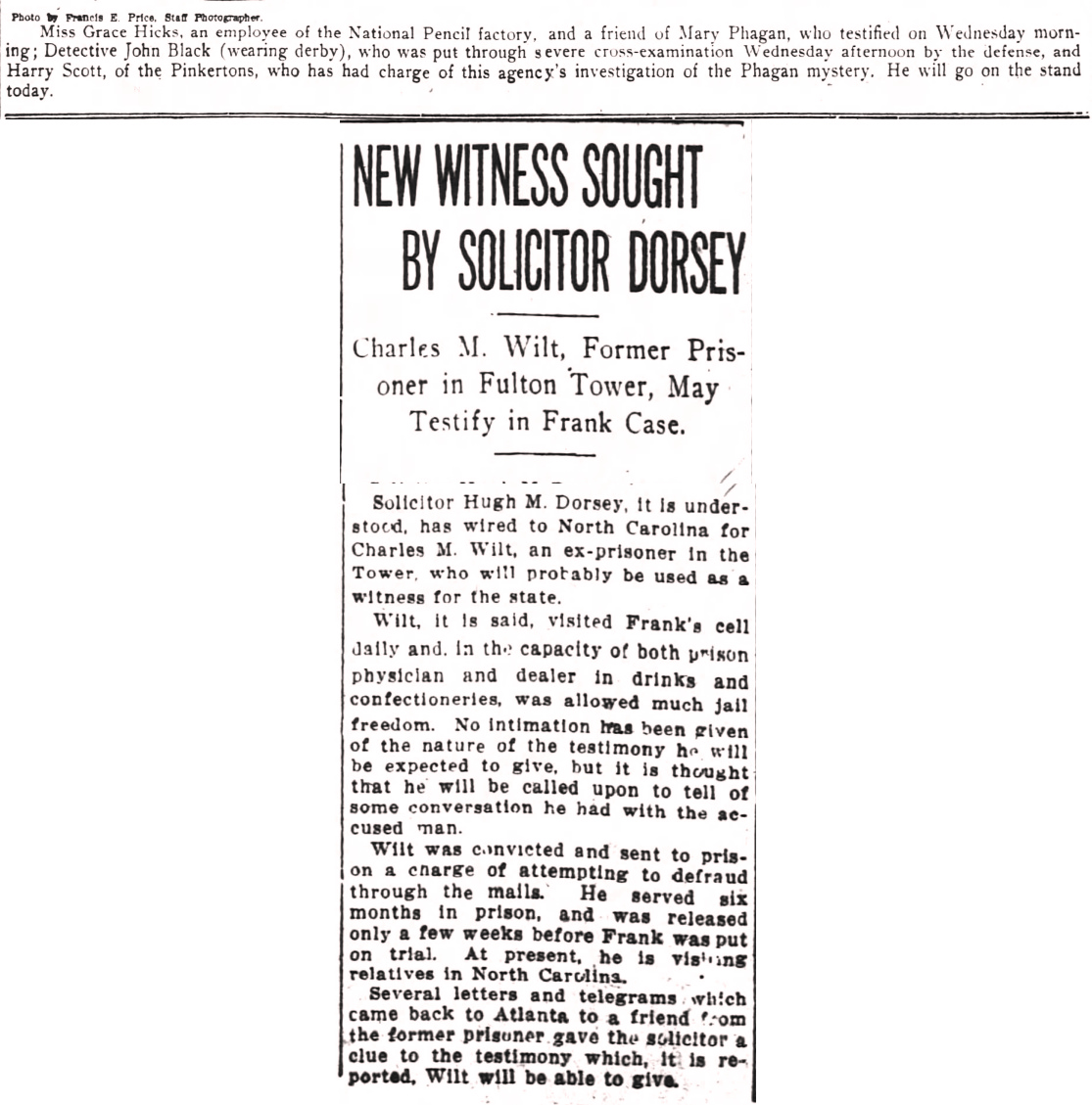 Solicitor Hugh M. Dorsey, it is understood, has wired to North Carolina for Charles M. Wilt, an ex-prisoner in the Tower, who will probably be used as a witness for the state.