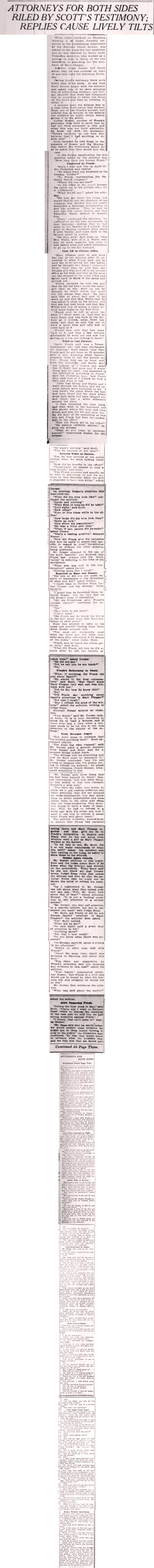 During Scott's testimony, there were lively tilts of all sorts. At one time Scott became angry with the solicitor and asked him if he were accusing him of withholding evidence, and Dorsey declared that Scott had entrapped him by promising to swear one thing on the stand and then by refusing to swear it.