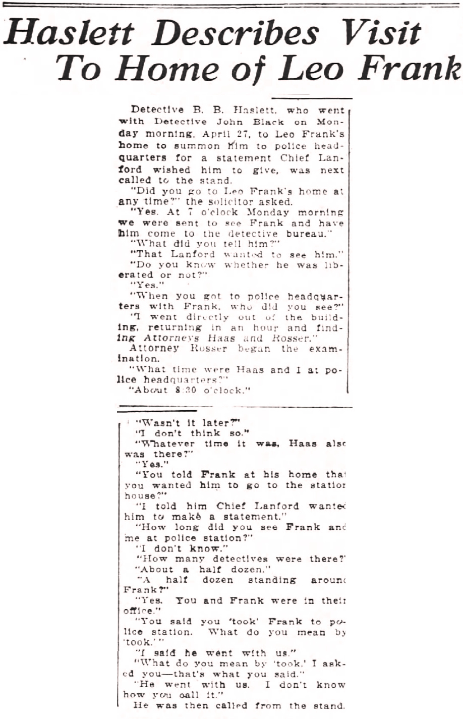 Detective B. B. Haslett, who went with Detective John Black on Monday morning, April 27, to Leo Frank's home to summon him to police headquarters for a statement Chief Lanford wished him to give, was next called to the stand.