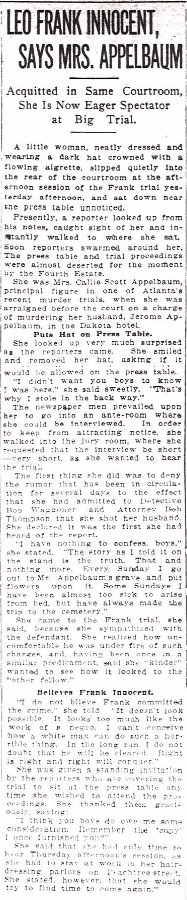 "I do not believe Frank committed the crime," she told. "It doesn't look possible. It looks too much like the work of a negro. I can't conceive how a white man can do such a horrible thing. In the long run, I do not doubt that he will be cleared. Right is right and right will conquer."