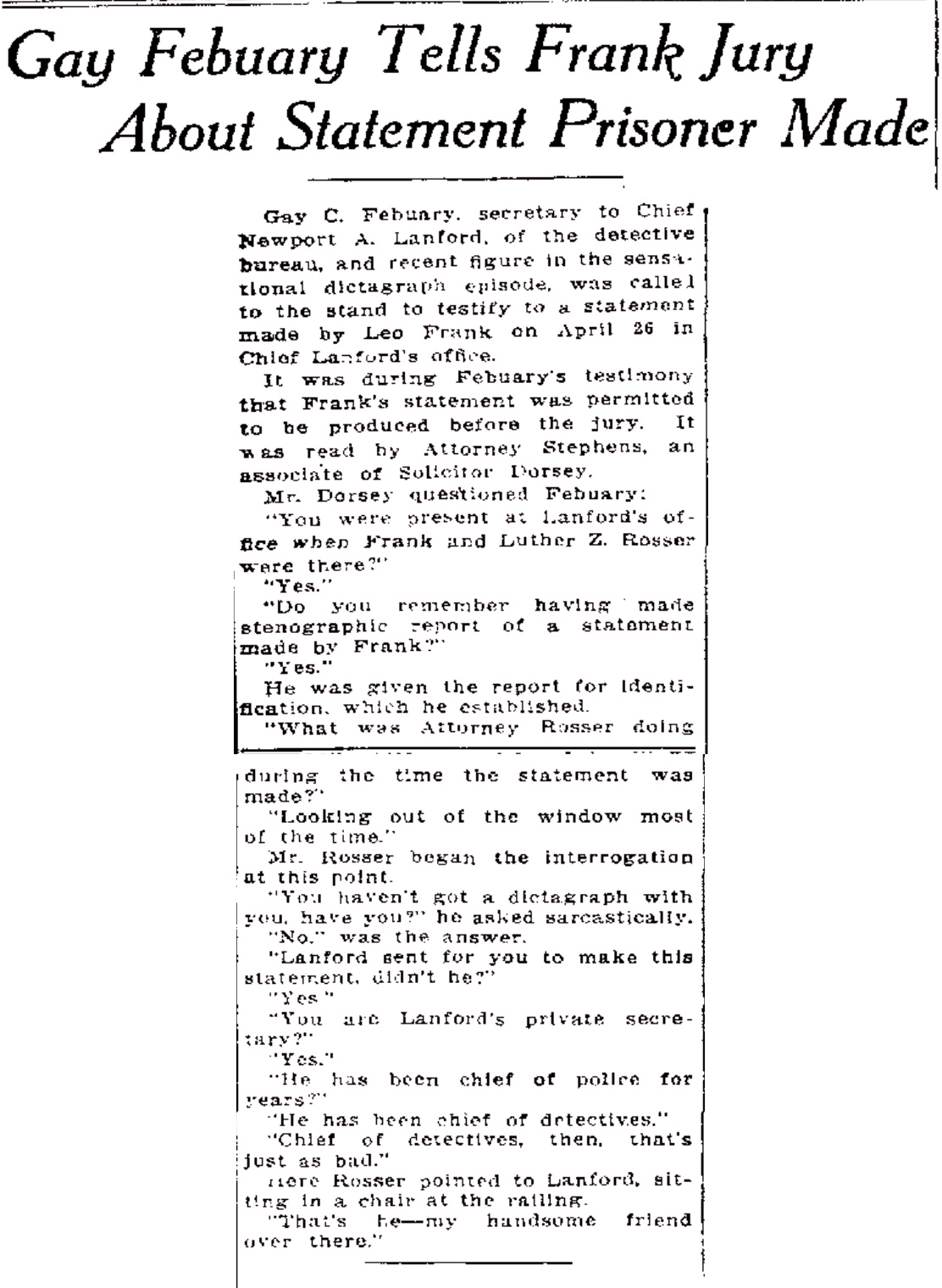 Gay C. Febuary, secretary to Chief Newport A. Lanford, of the detective bureau, and recent figure in the sensational dictagraph episode, was called to the stand to testify to a statement made by Leo Frank on April 26 in Chief Lanford's office.