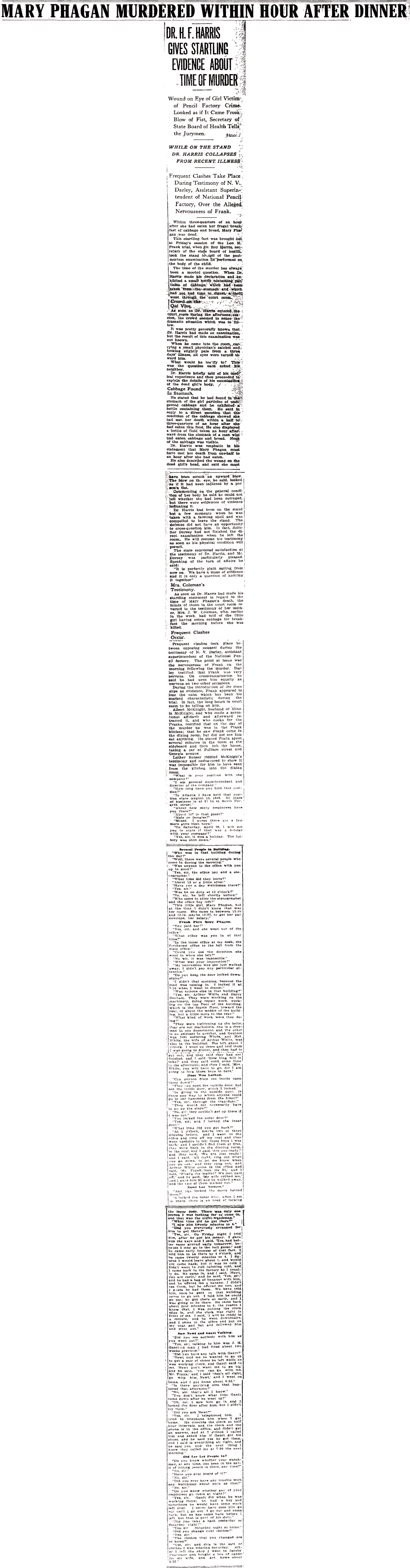 As soon as Dr. Harris had made his startling statement in regard to the time of Mary Phagan's death, the minds of those in the court room reverted to the testimony of her mother, Mrs. J. W. Coleman, who, earlier in the week, had told of the little girl having eaten cabbage for breakfast the morning before she was killed.