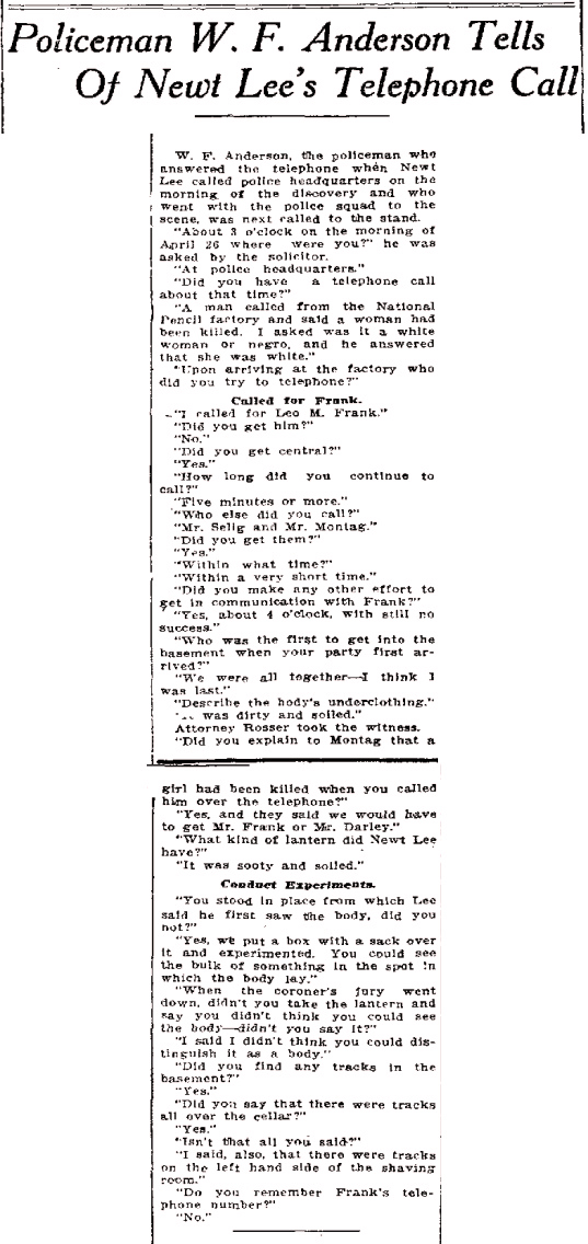 W. F. Anderson, the policeman who answered the telephone when Newt Lee called police headquarters on the morning of the discovery and who went with the police squad to the scene, was next called to the stand.