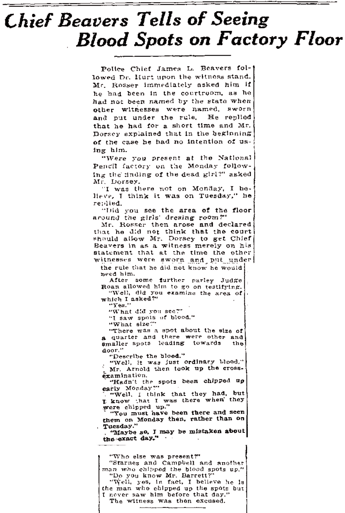 Police Chief James L. Beavers followed Dr. Hurt upon the witness stand. Mr. Rosser immediately asked him if he had been in the courtroom, as he had not been named by the state when other witnesses were named, sworn and put under the rule. He replied that he had for a short time and Mr. Dorsey explained that in the beginning of the case he had no intention of using him.