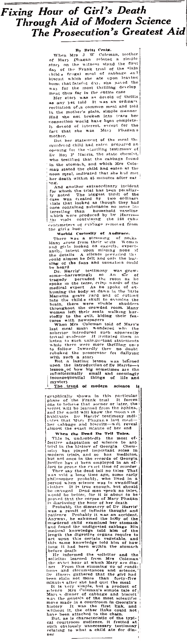 The trend of modern science is graphically shown in this particular phase of the Frank trial. It forces one to believe that sooner or later, the secret will be learned from the Sphinx, and the world will know the moon's inhabitants. Dr. Harris' testimony indicates that Mary Phagan's last meal—her cabbage and biscuits—will reveal almost the exact minute of her end.