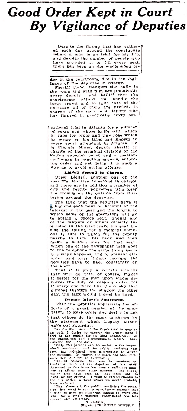 Sheriff C. W. Mangum sits daily in the room and with him are practically every deputy and bailiff that the courtrooms afford. To handle the large crowd and to take care of the entrance all of them are needed. In charge of the men is a deputy who has figured in practically every sensational trial in Atlanta for a number of years and whose knife with which he raps for order and tiny rose which he wears on his lapel are known to every court attendant in Atlanta. He is Plennie Miner, deputy sheriff in charge of the criminal division of the Fulton superior court and a master-craftsman in handling crowds, enforcing order and yet doing it in such a way as to avoid giving offense.