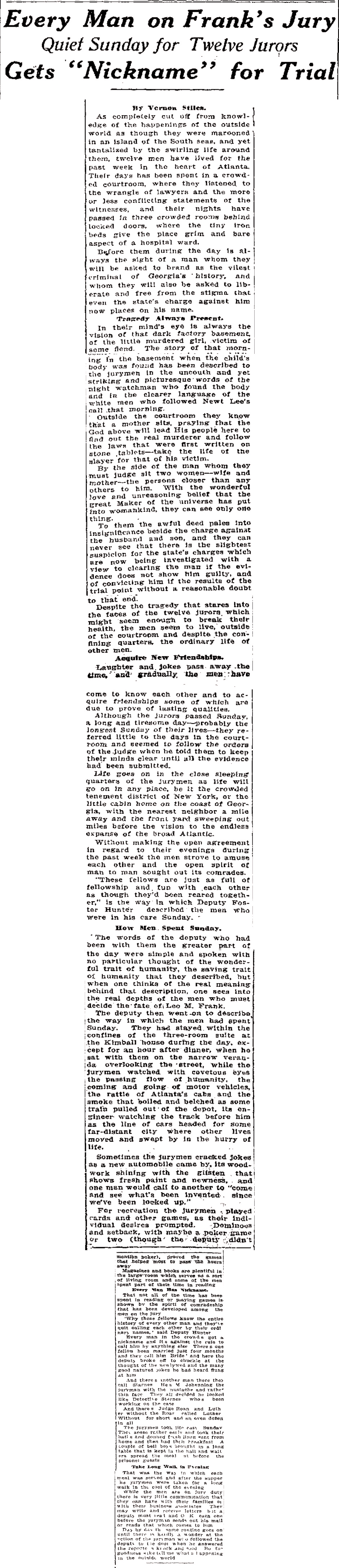 As completely cut off from knowledge of the happenings of the outside world as though they were marooned in an island of the South seas, and yet tantalized by the swirling life around them, twelve men have lived for the past week in the heart of Atlanta. Their days has been spent in a crowded courtroom, where they listened to the wrangle of lawyers and the more or less conflicting statements of the witnesses, and their nights have passed in three crowded rooms behind locked doors, where the tiny iron beds give the place grim and bare aspect of a hospital ward.