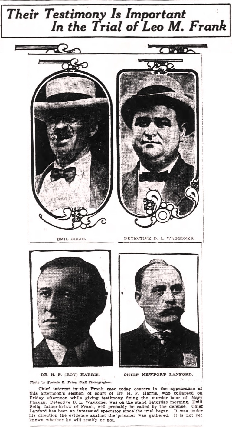 Chief interest in the Frank case today centers int eh appearance at this afternoon's session of court of Dr. H. F. Harris, who collapsed on Friday afternoon while giving testimony fixing the murder hour of Mary Phagan. Detective D. L. Waggoner was on the stand Saturday morning. Emil Selig, father-in-law of Frank, will probably be called by the defense. Chief Lanford has been an interested spectator since the trial began. It was under his direction the evidence against the prisoner was gathered. It is not yet known whether he will testify or not.