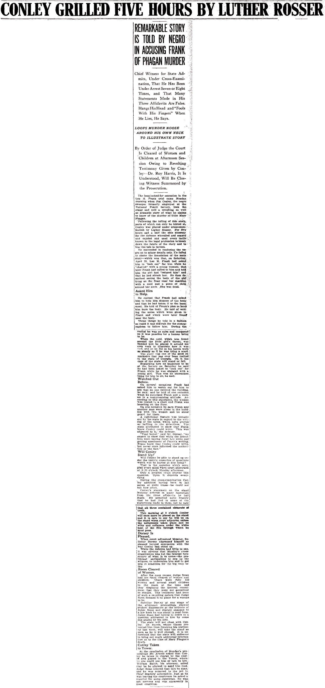 Following the telling of this story, parts of which can only be hinted at, Conley was placed under cross-examination by Luther Rosser. For five hours and a half the able attorney for the defense wheedled and coaxed and cajoled and used every tactic known to the legal profession to break down the fabric of the story and to tear the tale to tatters.