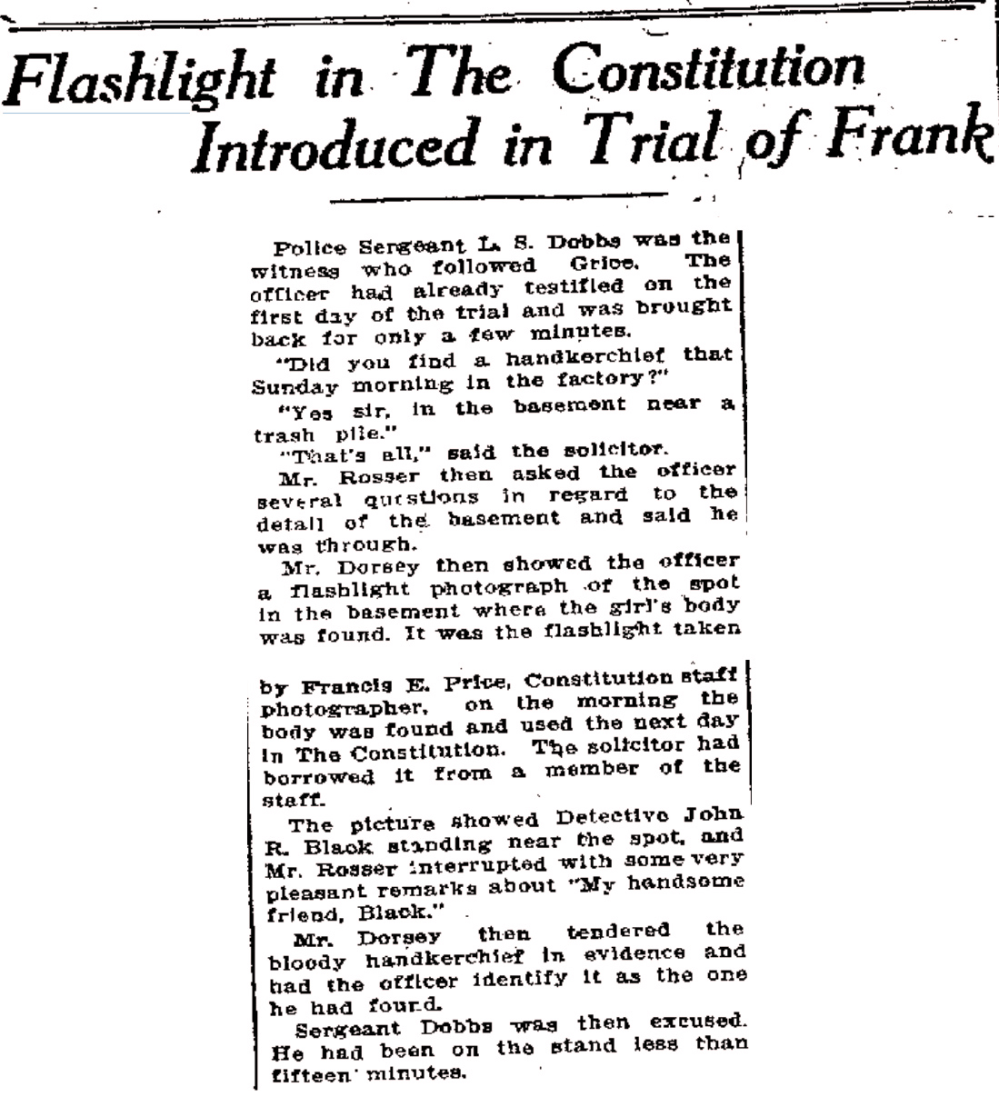 Mr. Dorsey then showed the officer a flashlight photograph of the spot in the basement where the girl's body was found. It was the flashlight taken by Francis E. Price, Constitution staff photographer, on the morning the body was found and used the next day in The Constitution. The solicitor had borrowed it from a member of the staff.