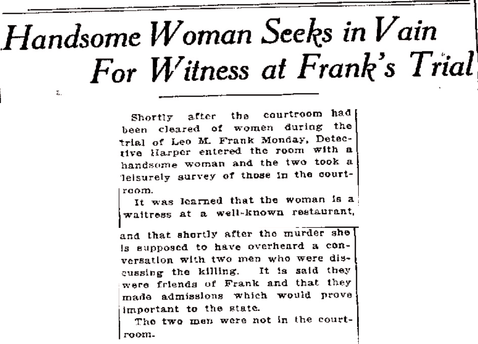 It was learned that the woman is a waitress at a well-known restaurant, and that shortly after the murder she is supposed to have overheard a conversation with two men who were discussing the killing. It is said they were friends of Frank and that they made admissions which would prove important to the state.