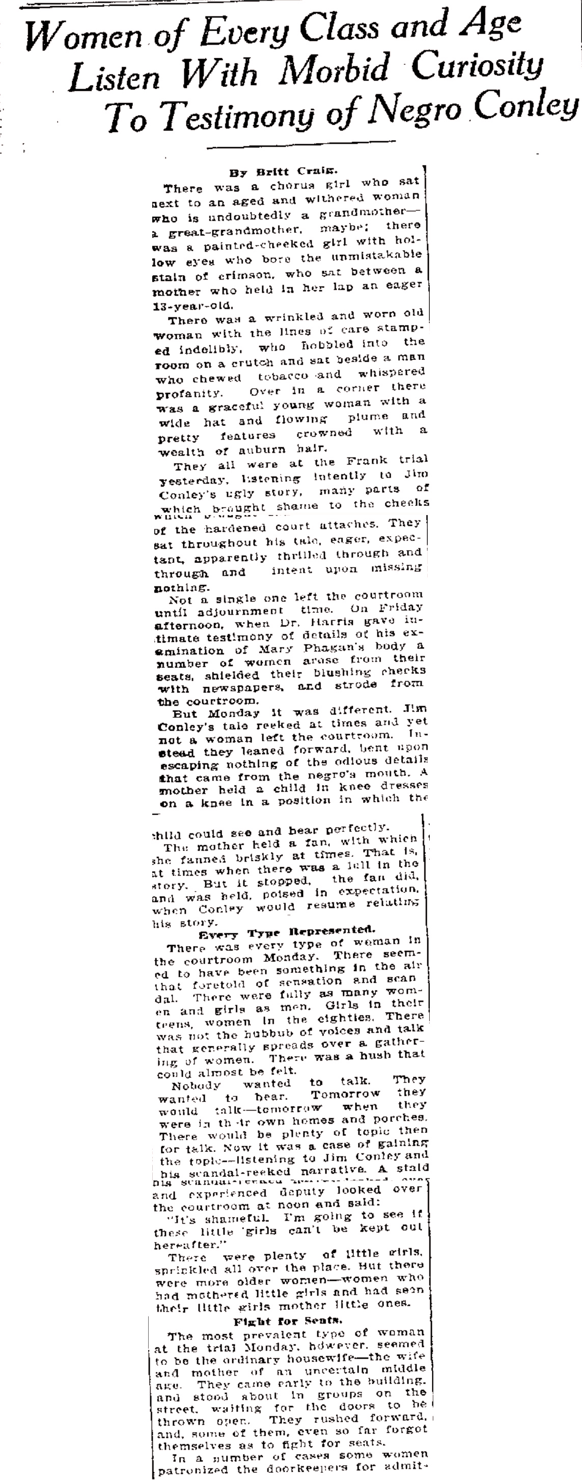Women were all over the courtroom, sprinkled here, there and everywhere. They sat between criminals, crooks and jailbirds. They didn't care where they sat or between whom, just so they found a seat. They fought for them, they demanded them. Pride nor anything else counted. Just so they got a seat—just so they could hear Jim Conley's story. Let the consequences take care of themselves.