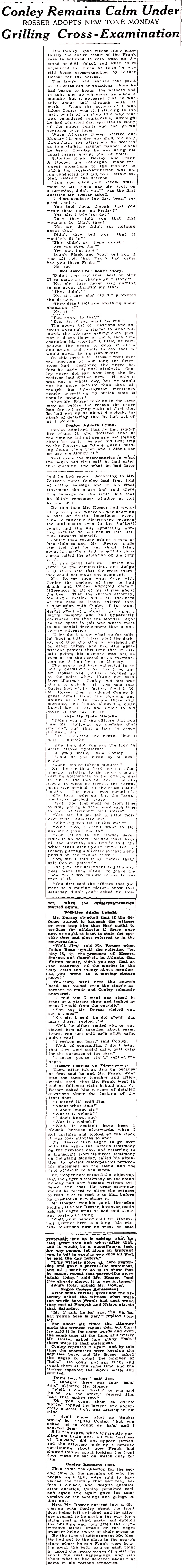 Jim Conley, upon whose story practically the entire result of the Frank case is believed to rest, went on the stand at 9:03 o'clock and when court adjourned for lunch at 12:30 he was still being cross-examined by Luther Rosser for the defense.