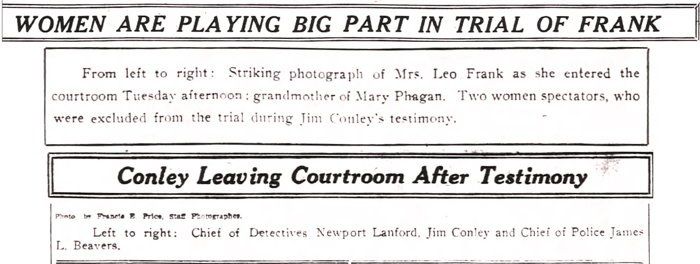 From left to right: Striking photograph of Mrs. Leo Frank as she entered the courtroom Tuesday afternoon; grandmother of Mary Phagan. Two women spectators, who were excluded from the trial during Jim Conley's testimony.