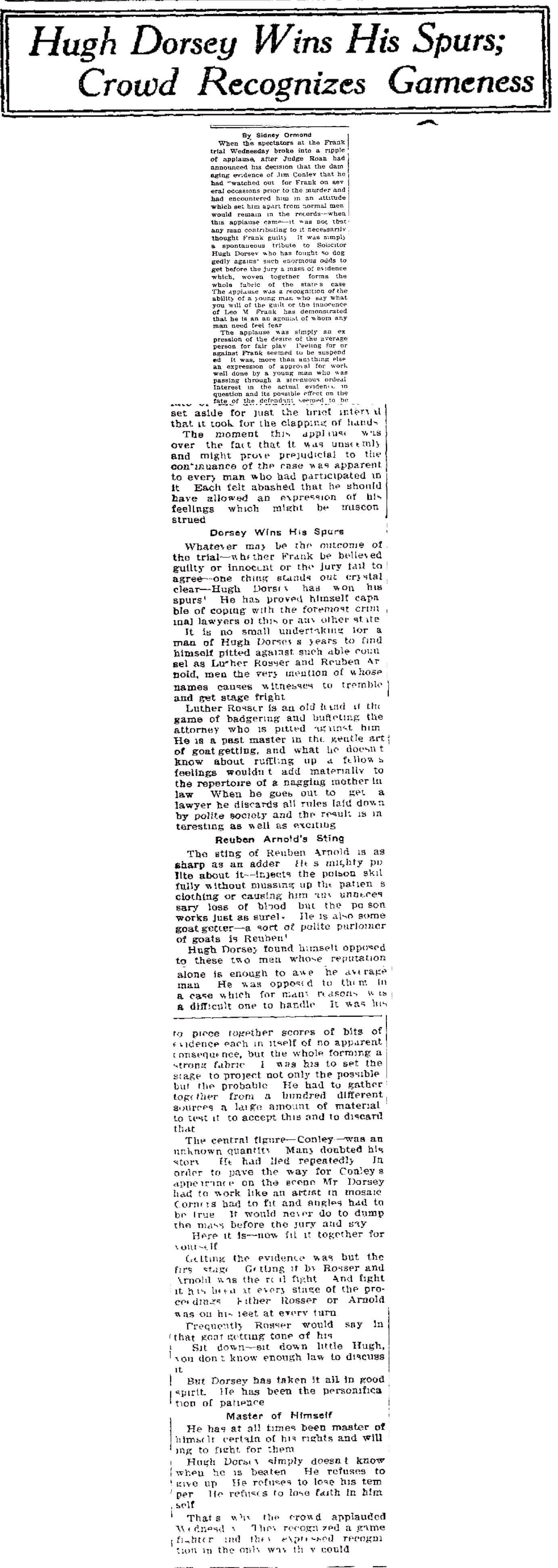 Whatever may be the outcome of the trial—whether Frank be believed guilty or innocent or the jury fail to agree—one thing stands out crystal clear—Hugh Dorsey has won his spurs. He has proved himself capable of coping with the foremost criminal lawyers of this or any other state.