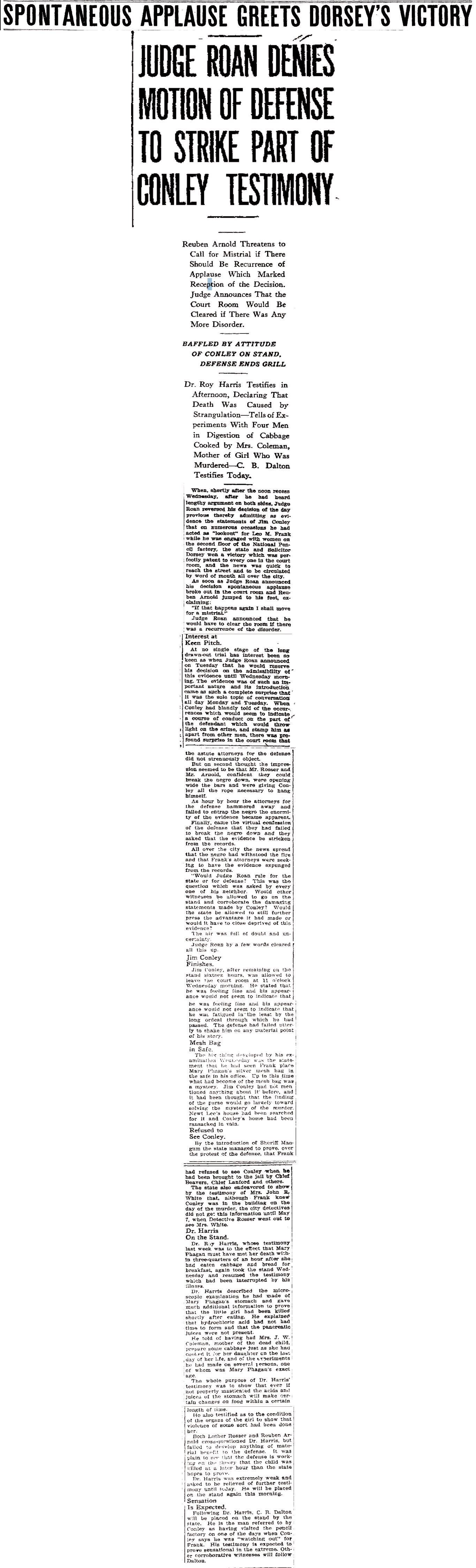 Following Dr. Harris, C. B. Dalton will be placed on the stand by the state. He is the man referred to by Conley as having visited the pencil factory on one of the days when Conley says he was "watching out" for Frank. His testimony is expected to prove sensational in the extreme. Other corroborative witnesses will follow Dalton.