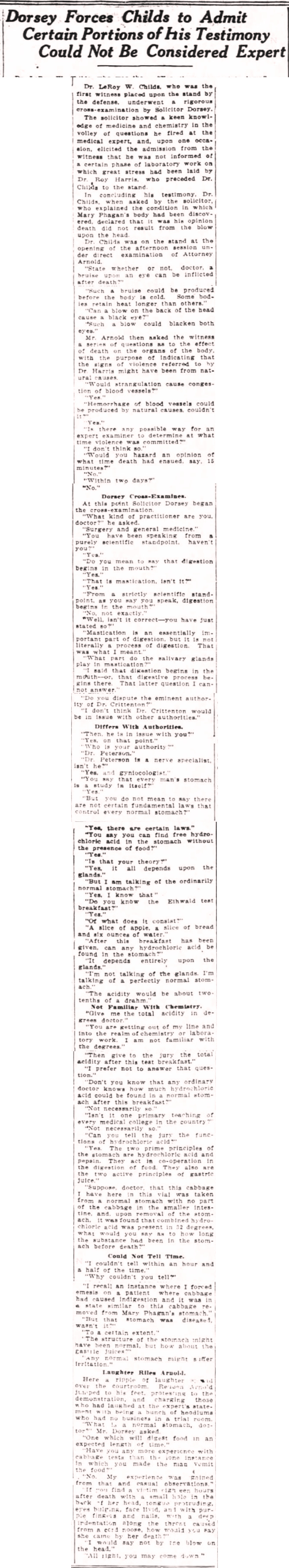 Dr. LeRoy W. Childs who was the first witness placed on the stand by the defense underwent a rigorous cross examination by Solicitor Dorsey.