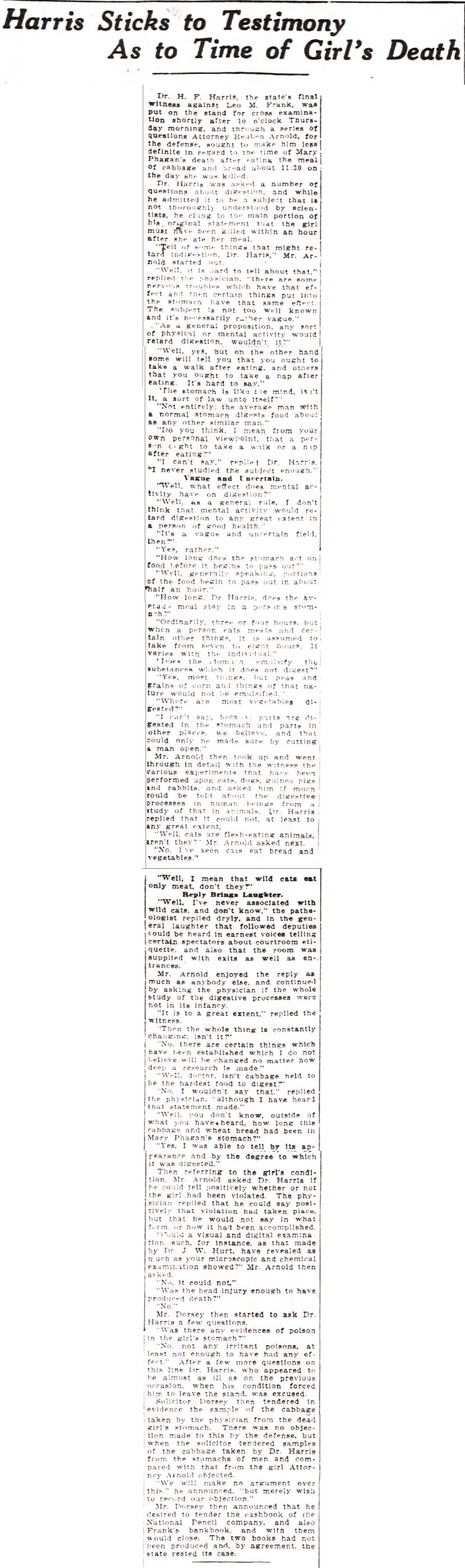 Dr. H.F. Harris, the state's final witness against Leo M. Frank, was put on the stand for cross examination shortly after 10 o'clock Thursday morning, and through a series of questions Attorney Reuben Arnold, for the defense, sought to make him less definite in regard to the time of Mary Phagan's death after eating the meal of cabbage and bread about 11:30 on the day she was killed.