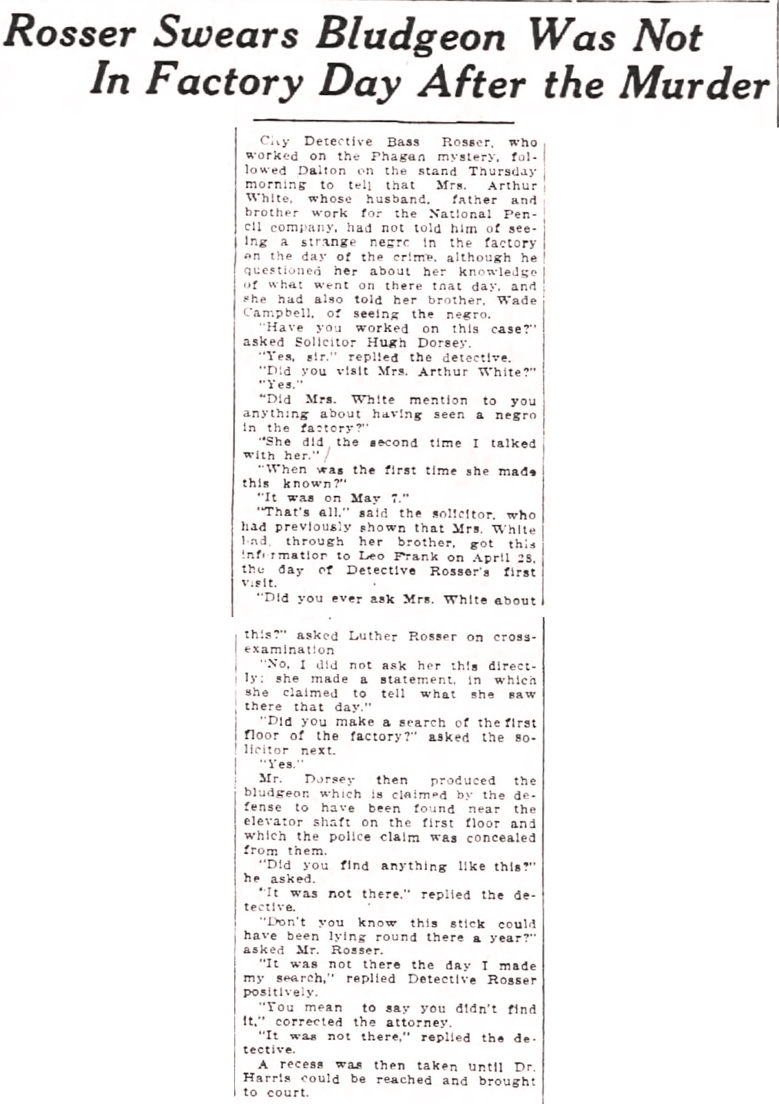 City Detective Bass Rosser, who worked on the Phagan mystery, followed Dalton on the stand Thursday morning to tell that Mrs. Arthur White, whose husband, father and brother work for the National Pencil company, had not told him of seeing a strange negro in the factory on the day of the crime, although he questioned her about her knowledge of what went on there that day, and she had also told her brother, Wade Campbell, of seeing the negro.